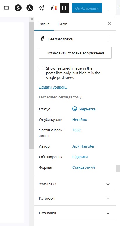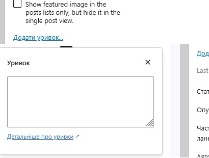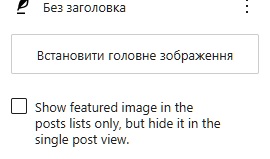 Нижче напис, з чек – віконцем для проставлення “галочки”: “Show featured image in the posts lists only, but hide it in the single post view.” = “Показувати вибране зображення лише у списках публікацій, але приховувати його в режимі перегляду окремої публікації.”. Якщо ми поставимо ту “галку” – зображення буде відображуватися у сніппетах пошуковиків та соцмереж й месенджерів, але його не буде видно на сторінці (запису) з фронту.