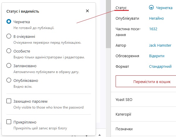 Це налаштування дозволяє визначити для сторінки чи запису її статус відносно публічності, варіанти такі: